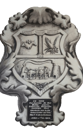 I was informed that the history of the coat of arms is unknown, but can be found in local archives. It appears to have been designed in 1969. Held in ornamentation, the bottom reads a plaque that says "EN 1868 Por decreto de Don Benito Juárez, Calera fué declarado municipio libre siendo en esa fecha Gobernador del Edo. Don T. G. de la Cadená. 1868 - 1969." [In 1868 by decree of Benito Juárez, Calera was declared a free municipality, being in that year Governor of the State Trinidad García de la Cadena]. The border of the shield reads, at the top, CALERA VICTOR ROSALES, the full name (it is named after Victor Rosales). At the bottom, the years 1868 and 1968; the centenary of becoming a municipality. The upper-left section depicts a cattle and horse head combined, recognizing the cattle-raising industry. Above is a bighorn sheep for its fauna. To the upper-right, an image of a corn cob, three stalks of wheat together, and five beans together for agriculture. Both upper sections are divided by a column. Dividing the lower and upper halves is a band reading "ZAC", the state. In the lower section, two lime (cal) kilns are depicted, along with a man having his two cattle push a cart. This remembers the development of industry here and its name.