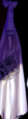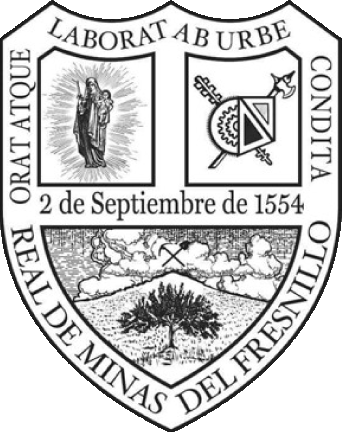 The coat of arms of Fresnillo was created in 1954 by Juan Antonio Tapia Varela, with the motive of the 400th anniversary of the foundation of Fresnillo on 2 September; he was recognized as the winner on 20 September, being declared as official beforehand in April. The border of the shield reads ORAT ATQUE LABORAT AB URBE CONDITA, meaning "A town that since its founding prays and works". At the bottom of the border, REAL DE MINAS DEL FRESNILLO. In the upper-left section, the Virgin of Candelaria, patron saint of Fresnillo, recognized by a candle in her right hand; to the upper-right, a shield, cogwheel, and crossed axe and spiked weapon, remembering the weapons used by the Indians and Spaniards plus the industry of Fresnillo. To the lower section, having as a background the Proaño Hill, a lone ash tree [Fresno] grows by a spring, remembering the origin of the municipal name. In the upper part is a crossed pick and shovel, remembering its mining. Diving the upper and lower areas is the foundation date, 2 de Septiembre de 1554.