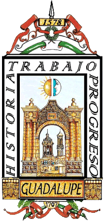 The coat of arms of Guadalupe was adopted officially in 1988 under the Municipal Regulations. Its designer is Pablo Reyes Cordero, as part of his duties under the Historical Research department of Guadalupe. Above the shield, a ribbon wraps around, bearing in its center the year 1578, the establishment of the first settlement here. A wreath of victory and a branch wrapped in a paper is also seen. Through the year is a lance. At the bottom, another ribbon around a lance and leaves; the year 1707 marks the establishment of an Apostolic College here, which earned it great fame. The border of the shield reads the motto "HISTORIA TRABAJO PROGRESO" [Work, History, Progress]. At the bottom, the name GUADALUPE heavily decorated and to its sides. In the center of the shield, an image of the Guadalupe Museum arch, reading its foundation year as such of 1878 by the State Government. Through the arch, an image of the Our Lady of Guadalupe Church. At the top, an image of a half of the sun and moon.