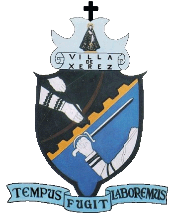 The coat of arms of Jerez was created by petition from the directors of the Chamber of Commerce in 1959, then a drawing was given back by Jesús Félix Valdes to them on pasteboard. During the time of Municipal President Fernando Robles (1968-1971), he charged Trustee Juan de Santiago of the Municipal Council with creating a municipal coat of arms. However, they realized that they had the drawing by Jesús, and so they asked the chamber and author if they could have permission to use it. Since 2014, after one of his children asked for 2 million pesos from the council, it has stopped being used in official documents. Below the shield is a ribbon that reads "TEMPUS FUGIT LABOREMUS"; [Time is running out, we shall work]. Above the shield over a scroll, bearing its title "VILLA DE XEREZ"; above Our Lady of Solitude; the scroll is topped by a cross, remembering the faith and its patron saint. The shield is divided diagonally into two; black and blue, with a spiked yellow band running across. In the black, an Indian with a bow and arrow; on the blue, a Spaniard with a sword, remembering the colonization and their conflicts.