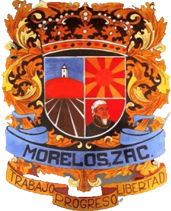The council approved its municipal coat of arms on 8 August 1987, being designed by Agustín Chavez, at the time director of the primary school. The council told him what they wanted, and then he added what was asked for onto his design. Surrounding the shield is ornamentation. Above it is a crown signifying royalty. Below is a ribbon reading "MORELOS, ZAC."; under this is a ribbon reading the motto "TRABAJO PROGRESO LIBERTAD". To the left side of the shield, a house is situated on a hill in front of a valley, remembering agriculture. To the lower-left, an image of José María Morelos, the namesake of the Municipality. The upper-right depicts the sun and its rays, representing progress and a new day.