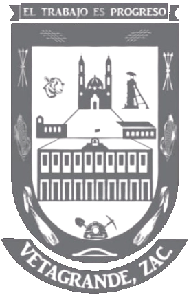 The coat of arms of Vetagrande was adopted in May of 1985 under Municipal President Pablo Sánchez Domínguez. It was designed by Francisco Javier Hernández Franco. It was adopted through a call for submissions from the Telesecundaria school "Emeterio Fragoso", where people in the third year participated. Above the shield, a ribbon reads the motto "EL TRABAJO ES PROGRESO" [Work is Progress]. Below, a ribbon reads "VETAGRANDE, ZAC." At the top of the border, multiple rows and columns of arrows are crossed. To the sides, there are also bundles of arrows, headbands, and a bow at the bottom; these remember the Indians that settled the area. Cobs of corn, meanwhile, also signify agriculture. In the inner section, the Municipal Palace is seen at the front. At the bottom, a miner's helmet and crossed pick and shovel, remembering the Mining Industry. At the top, a path and buildings leading to the Calvary Temple, signifying faith. To its sides, a mining winch (right) remembering the discovery of ore and sheep (left).
