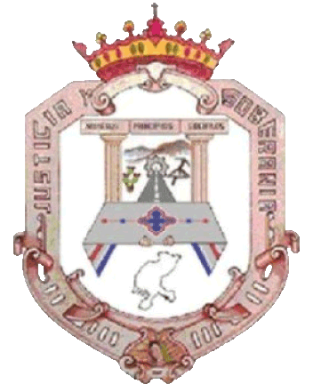 Apparently, the coat of arms of Villa García was adopted on 15 June 1988 and designed by Prof. Ernesto Ugarte Briano. At the top, a crown topped by a cross signifying the Spanish era. The border is shaped like an arch, referencing the local church. In its upper area, it reads "JUSTICIA Y SOBERANIA" [Justice and Sovereignty]. At the bottom, an image of Our Lady of Guadalupe, patron saint of the municipality. In the inner section: at the bottom, a map of Zacatecas, the state it is in. Above, a ribbon carrying a cross for faith. It leads to a road recognizing a main entry point to the town, that ends at a cogwheel signifying industry. Behind, an image of the mountains, part of the environment. A crossbow as used by the Spaniards is seen to the right; to the left, a cactus for the environment. These elements are enclosed by two Ionic columns, having above a slab that reads "NUESTROS PRINCIPIOS SEGUIMOS" [Our Principles We Follow]