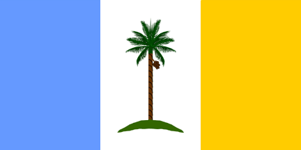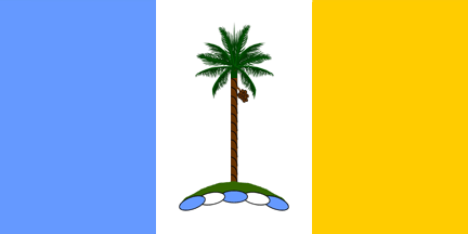 The flag is a tricolour consisting of vertical stripes of equal width of light blue (at the hoist), white and yellow; on the central (white) stripe is an areca nut palm (known in Malay as pokok pinang) on a mount. Light blue signifies the sea which surrounds the island. The white represents the State itself in its serenity. The yellow signifies prosperity. The betelnut (or areca nut) tree is the tree from which the island takes its name. There is no sultan of this state as it was once a component part of the British Straits Settlements.