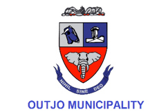 white with municipal coat of arms on it and blue inscription "OUTJO