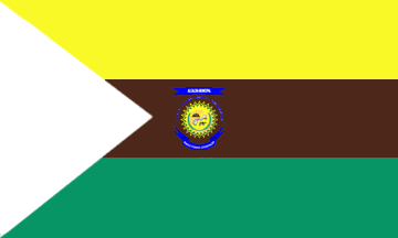 The flag is horizontally divided yellow-brown-green with a white triangle extending from the hoist. The coat of arms is placed centrally on the brown stripe.