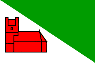 Flag: Diagonally divided from top hoist to fly bottom of white and green,