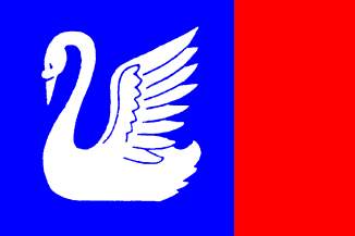 Flag: two vertical stripes of blue and red, proportioned 2:1; in the