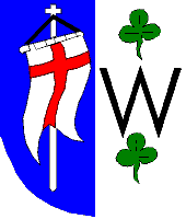 Description: "Per pale: I. in blue a silver cross-banner with red declining cross; II. In silver a black letter W with in chief and in base a green clover".