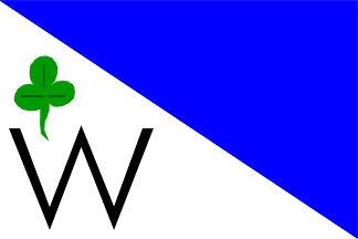 Flag: Diagonally divided from top-hoist to bottom-fly of white and blue; in white a black letter W of 1/3 flagheight; the first hook of the W topped by a geen cloverleaf..