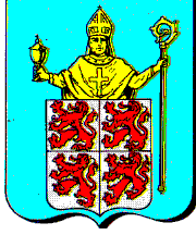 Arms: azure a bishop facing, holding in his right hand a covered chalice, in his left hand a crozier, all or; the bishop's feet behind an escutcheon argent quartered with four lions gules.