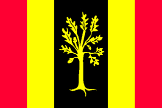 Flagdescription: five vertical stripes red - yellow - black - yellow - red, proportioned 1:1:2:1:1; in the center of the middle stripe a yellow stylized eradicated oak tree with a height of 4/5 flagheight.