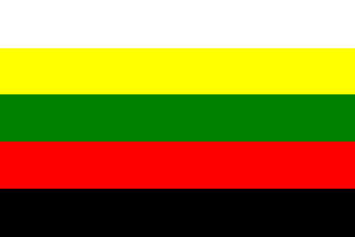 Flag: equally wide horizontal stripes of white - yellow - green - red - black.