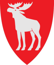 Blazon: I rødt en stående sølv elg. In English: Gules an moose stantant