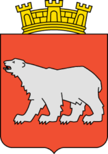 Blazoned in English: "Gules a polar bear passant argent."