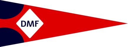 The flag of Drammen Motorbåtforening from Drammen a red pennant with black patches in the upper and lower hoist, and a white lozenge with the letters DMF.