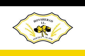 The flag of Hovsherad IL (Hovsherad Idrettslag) from Hovsherad in Lund Municipality is white with a narrow black upper edge and narrow yellow lower edge and with the badge centered.