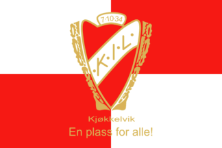 The flags of Kjøkkelvik IL (Kjøkkelvik Idrettslaget) from Bergen are red, white or red-white chequey with the badge centered.