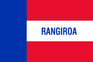 The flag of Rangiroa (photo, Tahitian Football Federation) is horizontally divided red-white-red with a blue stripe placed vertically along the hoist, that is, similar to the flag of Tuamotu, but with the name of the island written in blue capital letters in the white stripe, instead of the Tuamotu stars.
