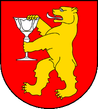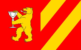 The flag is horizontally divided. At hoist, in red field a yellow bear with