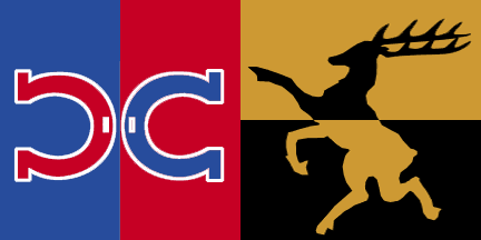 horizontal gold and black with jumping Red Deer, also in reverse colors.