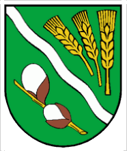 "Arms: on a green field separated by a slanted silver, wavy ribbon,