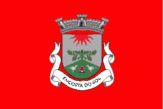 Shield Argent, in base a mountain issuant Vert; charged with an oven Argent masoned Sable with mouth Gules,flanked by two larks statant affronty Argent eyed Gules, the mountain crowned by a pomegranate tree Vert with six pomegranates of the same slipped Gules, in chief a demi sun radiant Gules issuant from chief. Mural crown Argent with three visible towers (village rank) and white scroll with inscription in black initials: "ENCOSTA DO SOL"