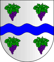 Shield Argent between two bunches of grapes Purpure leafed and stemmed Vert a castle Sable with port and windows Argent, and on base wavy Azure a fess wavy Argent.