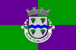 Mural crown Argent with four visible towers (town rank) and white scroll reading in black upper case letters "CELORICO DE BASTO"