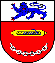 Shield Gules a weaver´s shuttle Or in fess with yarns Azure, on base a part of a chain Or, chief Argent charged with a lion passant guardant Azure armed and tongued Gules.