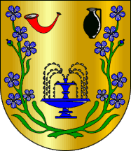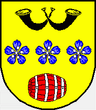 Shield Or three flax blossoms Azure seeded Argent in fess, on chief two hunting horns Sable intertwined and in fess, on base a barrel Gules with hoops Argent.