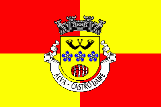 Mural crown Argent with four visible towers (town rank) and white scroll reading in black upper case serifed letters "ALVA - CASTRO DAIRE".