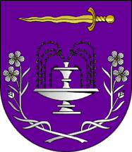Shield Purple a fountain Argent playing Argent and Azure,flanked by two flax plants with flowers Argent seeded Or crossed per saltire on base, on chief a sword flamant Or in fess.