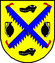 Shield Or two bi-manual saws Azure hafted Gules in saltire, on chief and base flanked by a wooden shoe Sable, at dexter and sinister by a jug Sable.
