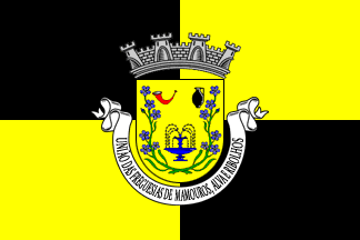 It is a typical Portuguese communal flag with the coat of arms centred on a field quartered of black and yellow.