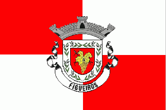 Shield Gules, a grape bunch Or leafed of the same, bordure Argent semy of olive branches Vert fructed Sable. Mural crown Argent with three visible towers (village rank) and white scroll with inscription in black capitals: "FIGUEIROS".