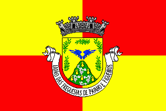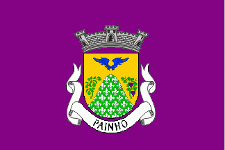 Shield Or a mount issuant Vert semy of alternating grape bunches Argent and pears Or, on chief a pair of wings Azure, on orle five olive branches Vert fructed Sable, three on chief and two on flanches. Mural crown Argent with three (!) visible towers (village rank) and white scroll reading in black upper case serifed letters "UNIÃO DAS FREGUESIAS DE PAINHO E FIGUEIROS".