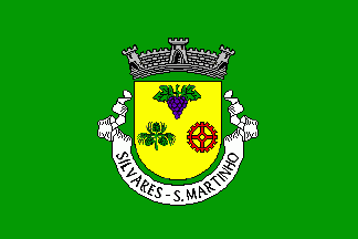 Shield Or a pine branch Vert fruited of the same and a cogwheel Gules in fess, on central chief a grape bunch Purpure leafed Vert. Mural crown Argent with three visible towers (village rank) and white scroll reading in black upper case serifed letters "SILVARES - S. MARTINHO".