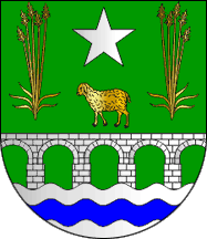 Shield Vert with base wavy of Argent and Azure, a scallop Or flanked by two bunches of bulrush Argent, issuant from base a throughout bridge Argent, masoned Sable and having five arches. Mural crown Argent with three visible towers (village rank) and white scroll with inscription in black capitals "JUNCAIS".