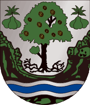 Shield Argent, within a representation of a gorge valley of Vert and Sable, charged with a fess wavy Azure fimbriated Argent, a chestnut tree Vert fruited Or trunked and eradicated Sable between two triplets of pears, each Vert leafed and trunked of the same. Mural crown Argent with five visible towers (city rank) and white scroll reading in black upper case letters "FUNDÃO".