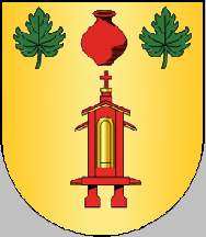 The red clay jug is symbolising arts and crafts, especially pottery. Wine leaves and granary are symbolising agriculture, especially viticulture and the production of cereals, mainly among those corn.