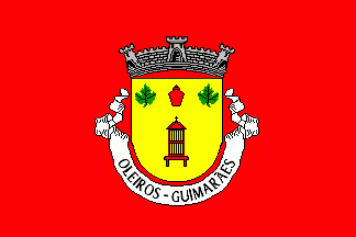 Shield Or, a granary Gules with window Or, in chief a clay pot Gules, flanked by two wine leaves Vert. Mural crown Argent with three visible towers (village rank) and white scroll with inscription in black capitals "OLEIROS - GUIMARÃES".