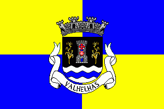 Shield Sable with base wavy of Argent and Azure, an impending embattled tower Argent masoned Sable with port and windows Azure, charged with an orbicular cross Gules above the window and a cross patty Gules charged with a Greek cross Argent beneath, the whole flanked by two corn plants Or. Mural crown Argent with four visible towers (town rank) and short white scroll, in Bénard Guedes style, reading in black upper case serifed letters "VALHELHAS".