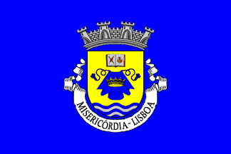 Shield Azure, an escarbuncle consisting of 16 branches of ash Or, in chief charged with an oval inescutcheon Or, four pales Gules with chief Argent, charged with a cross patty Gules. In base an 8-point star Or in a lunel Argent. Mural crown Argent with three visible towers (village rank) and white scroll reading in black upper case letters "MERCÊS - LISBOA". I couldn't find any flag information.