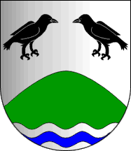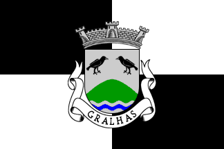 Shield Argent two crows Sable respectant, issuant from base wavy Argent charged with a barrulet wavy Azure a mound Vert. Mural crown Argent with three visible towers (village rank) and short white scroll, in Bénard Guedes style, reading in black upper case serifed letters "GRALHAS"