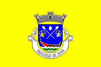 Shield Azure with base wavy of Argent and Azure, crowned by a local boat Gules garnished Or and Sable in chief two spoons Argent crossed per saltire and flanked by two comedy masks from the theatre (Or tied Argent at dexter and Argent tied Or at sinister), between the spoons' heads an egg Argent. Mural crown Argent with three visible towers (village rank) and white scroll with inscription in black initials: "". "FREGUESIA DE OVAR".