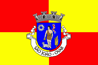 Shield Azure, St. John the Baptist proper, dressed in furs, holding a labarum with (white flag divided by red Latin cross in his left hand and a scallop Or in his right hand; at his feet a lamb couchant Argent, in sinister base a corn cob Or leaved of the same, in dexter chief a cogwheel Argent. Mural crown Argent with four visible towers (town rank) and white scroll with inscription in black initials: "SÃO JOÃO - OVAR".
