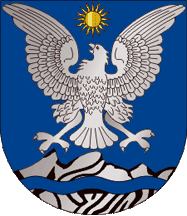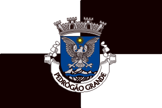 The arms are Azure above a mound Argent enhanced Sable issuant from the base and charged with wavy fess of the field an eagle Argent displayed and looking at a sun Or in center chief. Mural crown argent with four visible towers (town status) and white scroll reading in black upper case letters "Pedrógão Grande". "Pedrógão" is a cognate of "_pedra" (= "stone") and an archaism for "crag", which makes the stony hill issuant from the base on the coat of arms a canting element.