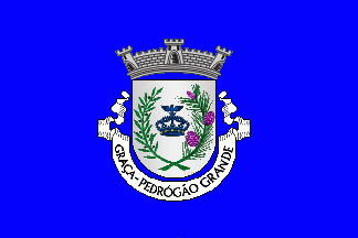 Shield Argent, a Marian crown Azure between an olive branch Vert fruited Sable and a pine branch Vert with pine cones Purpure, both branches are tied in base per saltire. Mural crown Argent with three visible towers (village rank) and white scroll with inscription in black capitals "GRAÇA - PEDRÓGÃO GRANDE".