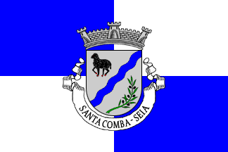 Shield Argent a bend wavy Azure, in dexter chief a sheep Sable animated and armed Gules, in sinister base an olive Branch Vert fructed Sable. Mural crown Argent with three visible towers (village rank) and white scroll reading in black upper case serifed letters "SANTA COMBA - SEIA".